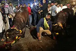 The buffaloes are decorated with garlands of flowers, painted horns, and paraded through the streets, often accompanied by the crowd dancing to the sounds of teen maar Special Yadav Band (Da Daniki).[1] The animals are sometimes encouraged to rear up on their hind legs.