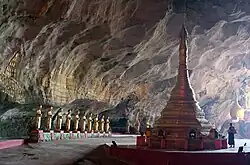 Saddan Cave (ဆဒ္ဒန်ဂူ) is a major Buddhist cave temple with hundreds of small Buddha statues. It is located in the southernmost point of the Zwegabin Mountain range, Hpa-An, Kayin State, Myanmar. Saddan Cave is 107 metres (351 ft) long from east to west and 40 metres (130 ft) wide, and is the longest cave in Karen State with a narrow entrance. The cave is located at a height of about 30 feet (9.1 m) from the ground and has a round shape. The cave is named after Saddan, the king of elephants who lived near the cave. The largest of the stalagmites is called the "Stone Pillar of the King of Elephants". The Saddan Cave Pagoda festival is held every year on the last day of Thingyan.[1][2] At the exit of Saddan Cave, there is a large lake, which is said to be King Saddan's bathing lake. Saddan Cave was a resting place for the legendary King Paarwana (ပအာဝနမင်းကြီး) when he was a hunter, according to Karen legend.[3]