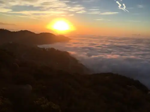 Saddle Peak is a mountain located in the Santa Monica Mountains between Malibu and Calabasas. The summit is accessible via the Backbone Trail. There is also a feeder trail to the top from near the top of Stunt Road (just 1 block below the ridge intersection with Scheuren Road at the viewpoint) maintained by the Santa Monica Mountains Conservancy. And there is an informal trail up the bottom East nose of the massif right across the intersection from the Scheuren Viewpoint. This latter trail passes around a water tower and eventually joins the main trails near the top.