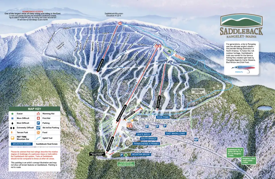 All the trails at Saddleback are named after famous fishing flies created in Rangeley by anglers Carrie Stevens, Bud Wilcox, and Dick Frost. Some of these fly names include Supervisor, Peachy's Peril, Royal Tiger, and America. All of the chairlifts at Saddleback are named after popular fly fishing rivers, such as the Rangeley River, South Branch (of the Dead River), and the Magalloway River.
