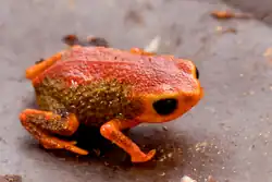 The bright yellow, orange or reddish colours of many species in this genus are generally considered aposematic (warning colours),[7][15] but toxicity has only been studied in a few species. The brightly coloured B. ephippium and B. pernix have tetrodotoxin and similar toxins in their skin and organs, whereas B. nodoterga, which has a much more subdued colouring but still with some yellow-orange, appears to be non-toxic.[6][29] It is unknown how certain Brachycephalus species attain the strong neurotoxins, but they are possibly absorbed from the small invertebrates they eat, as known from some poison dart frogs and mantella frogs,[17][29] or produced by bacteria inside their body.[30]
