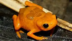 The saddleback toads (Brachycephalus) are a genus of tiny toads and frogs in the family Brachycephalidae in the order Anura,[1][2] ranging from south Bahia to Santa Catarina in southeastern Brazil.[3] The genus includes two main groups, the often brightly coloured pumpkin toadlets, and the overall brown and more frog-like flea frogs (or flea toads), which once were placed in their own genus Psyllophryne.[4][5] Some pumpkin toadlets are toxic and their often bright colours are considered aposematic.[6][7] At about 1 cm (0.4 in) or less in snout–vent length, the flea frogs are some of the smallest frogs in the world.[4][8]