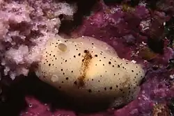 The saddled nudibranch is a pale-bodied dorid with a brownish saddle-shaped band across the middle of its back and scattered black spots over the notum. The saddle may be continuous or fade in the middle. This animal may reach a total length of 30 mm.[2]