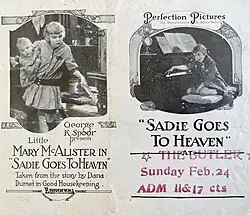 Sadie Goes to Heaven is a 1917 American silent comedy film directed by W.S. Van Dyke and starring Mary McAllister, Frances Raymond and Rod La Rocque[1]