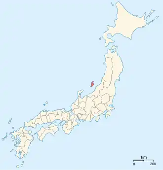 Sado Province (佐渡国, Sado no Kuni; Japanese pronunciation: [saꜜ.do (no kɯ.ɲi)][1]) was a province of Japan until 1871; since then, it has been a part of Niigata Prefecture.[2] It was sometimes called Sashū (佐州) or Toshū (渡州). It lies on the eponymous Sado Island, off the coast of Niigata Prefecture (or in the past, Echigo Province).