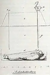 In 1829, Dr. Johann Gottfried Taberger designed a system using a bell which would alert the cemetery nightwatchman. The corpse would have strings attached to its hands, head and feet. A housing around the bell above ground prevented it ringing accidentally. An improvement over previous designs, the housing prevented rainwater from running down the tube and netting prevented insects from entering the coffin. If the bell rang the watchman had to insert a second tube and pump air into the coffin with a bellows to allow the occupant to survive until the casket could be dug up.