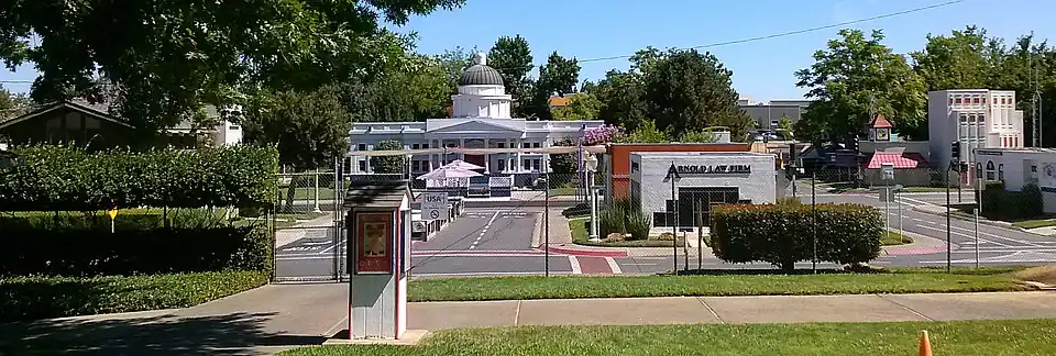Safetyville, USA is a traffic park and miniature city that spans a little over 3 acres of land in Sacramento, California. It is a program designed to provide safety education to young children in an interactive manner. The miniature town features scaled-down replicas of the California State Capitol building, municipal building, business buildings, and various streets in Sacramento, California.