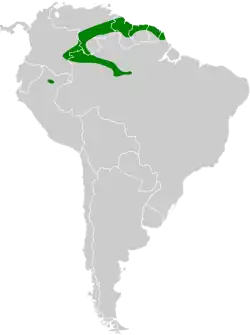 The range in northern South America is the coastal Guianan region extending into coastal northeastern Brazil, the north of Amapá state. The range extends westward from Guyana into southeast Venezuela, eastern Colombia and then extends southeasterly down the Rio Negro (Amazon) river wildlife corridor to the Amazon River and then to the Madeira River, it also goes upstream on the Amazon River 250 km to the Purus River.