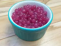 In some recipes, wine is mixed with grape juice, with the intent of making the dessert sweeter and less alcoholic. It is also common to infuse the wine with cinnamon and cloves to add flavor to the dish.[1] Although tapioca pearls can be made at home, they are more commonly store-bought.[1]