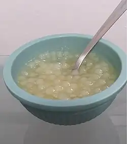 Sagu (from Malay sago or sagu) originally referred to starch extracted from Southeast Asian sago palms (saguzeiro in Portuguese), which is usually made into sago pearls in Southeast Asian cuisine.[2][6] After cassava (native to South America) was introduced to Southeast Asia during the colonial era, it became an alternative starch source for making pearl sago, resulting in the name "sagu" or "sago" being used interchangeably for cassava, potato or sago starch in European cuisine.[7][8][9][10] The making of tapioca balls was introduced to Brazil after the arrival of European immigrants, which became known as sagu, despite being made from native cassava starch.[2]