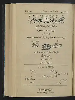 Sahifat Dar al-Ulum (Arabic: صحيفة دار العلوم; DMG: Saḥīfat Dār-al-ʿUlūm; English: "The Journal of the House of Sciences") was an Arabic journal published in Cairo from 1934 to 1947. It was founded by Sayyid Qutb (1905-1966), a well-known Egyptian writer, poet, and critic, who is considered to be one of the Muslim Brotherhoodʼs most important thought leaders, as well as Saʿd al-Labban and Muhammad Ibrahim Jabr.[1] After training as a teacher, Qutb graduated from the Dār al-ʿUlūm University in Cairo during the founding year of the journal.[1] In terms of content, the editors focused on the “latest pedagogical, social and linguistic theories”[2] and pursued the goal to compete with the reputation of al-Azhar and the Egyptian University through their intellectual Islamic orientation and their high demands on the students.[3] In addition to Saḥīfat Dār-al-ʿUlūm, Qutb also published his articles in other journals of various ideological orientations, including ar-Risala[4] and aš-Šuʼūn al-iğtimāʿīya.[5]