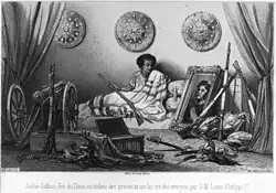 Sahle Selassie also worked to modernize his country, and like his contemporaries Goshu of Gojjam and Wube Haile Maryam of Tigray, he made contacts with European countries like France and Great Britain in hope of gaining craftsmen, educators, and above all firearms. Like his contemporaries, he understood the value of firearms, and increased the number in his armories from a few score when he took office to 500 in 1840, and doubled that number again by 1842.[20] He signed treaties of friendship with both France (16 November 1841) and Great Britain (7 June 1841).[21] The Negus also encouraged foreigners to settle in Shewa, and offered considerable incentives to them, such as the revenue from a large village he granted a Greek mason by the name of Demetrios. As a result, at one point a number of foreigners were present in Shewa, who included a number of Greeks, at least one Armenian, and several traders from Eastern lands.[22]