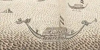Shortly after this, the VOC-backed Sultan of Ternate, Mandar Syah, was opposed by his brothers and part of the Ternatan elite. The Dutch commander Arnold de Vlamingh van Outshoorn suppressed an attempt to replace Mandar Syah, and the Ternatans had to agree on a treaty in 1652 where they were stipulated to extirpate clove trees in their dominions.[10] This would ensure VOC monopoly on the spice trade, but the treaty was insufficient as long as Tidore sold its cloves to other buyers. Since Saidi actively supported the rebels in Ternate without Spanish approval, De Vlamingh van Outshoorn declared war on Tidore, hoping to eliminate the Tidorese clove production. In order not to antagonize the Spanish, Tidore Island was not attacked; rather, an expedition under Simon Cos was dispatched to worst Tidore's vassals in Halmahera and the Papuan Islands. The expedition was not particularly successful, and in the meantime the Papuan Raja of Salawati raided in Ambon on behalf of Sultan Saidi.[11] However, the efforts of Saidi to take over the Ternatan parts of Halmahera also failed, and the increasingly irritated Spanish finally arrested the Sultan in 1654 for disturbing the peace.[12] He was however soon set free again, and peace with the VOC followed.[13] The Spanish claimed that they saved the skins of the Dutch in Maluku by depriving the rebels in Ternate and Ambon of Tidorese support.[14]