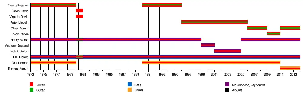 - 1973–1999, 2005–2014: Nickelodeon, accordion, piano, marimbas, synthesised brass and reed, synthesisers, acoustic/electric guitars, computer programming, vocals