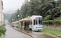 The second class of Alsthom-Vevey tramcars (20) are capable of reaching a maximum speed of 70 km/h. They were built on 23.24 m (76 ft 3 in) long H chassis and have an empty weight of 27.4 tonnes. Delivered beginning in spring 1998, 10 of the 20 cars entered service in time for the 1998 FIFA World Cup matches in June, and initially also used trolley pole current collection like the older trams, as the overhead wiring had not yet been modified for pantographs.[6][7] However, the other 10 were due to be delivered with pantographs,[6] and the earlier 10 of this series due to be converted to pantographs after mid-July 1998. The current delivered is 600 V DC.