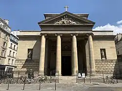 The facade has six columns with Ionic order capitals. The first four columns form a peristyle, or porch. It is a very sober style, with a minimum of decoration. It is topped by a triangular fronton, with figures by Jean-Jacques Feuchère (1807-1852) completed in 1845. The figures represent the three theological virtues; Faith in the center, with a chalice and the host; Hope on the left, seated at a table, writing in Hebrew; and Charity is on the right, protecting an infant and gesturing toward a book which displays an extract of the Hymn to Charity by Saint Paul.[3]