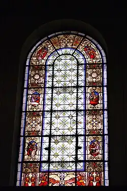 The 19th-century stained-glass windows have a large amount of white glass, to increase the amount of light in the church. The colors change with the light throughout the day.