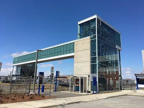 The station has two buildings. One, located at the northeastern end of the station on Boulevard Lacordaire, provides elevator access to platform 1, as well as adjacent outdoor stairs (Boulevard Lacordaire is built in a cutting and passes under the tracks at this point). The second is an enclosed overhead walkway passing over the tracks, providing stair and elevator access between the platforms and connecting to the station's main parking lot to the south. Platform 2 also opens onto this parking lot via a walkway, and another walkway connects the southwest end of platform 1 with a park-and-ride lot north of the station on Avenue Jean-Meunier.