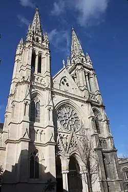Saint-Louis Church was built between 1874 and 1880 following the plans of Pierre-Charles Brun.[1] Consecration occurred in 1895 by Mgr Lecot. It is 60.35 meters long by 23 meters wide and 22.26 meters high under vaults.[2] The high towers measure 58 meters and are visible from all over the city[3] above the elegant quartier des Chartrons (Chartrons district), on the north of Place des Quinconces.