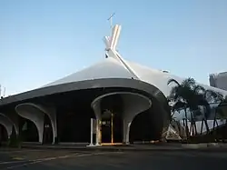 Built by National Artist for Architecture Leandro Locsin in 1968, the design of this parish church is symbolic of the manner the martyr died: crucified on an X-shaped cross. The butterfly shaped floor plan emanates from this cruciform. Many other symbolic features mark the tent-like structure, including the giant chandelier over the altar which serves as a halo over the copper cross by National Artist for Visual Art Vicente Manansala.[3]