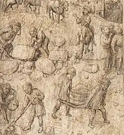 The tower, like the drawing itself,[8] is still under construction, and the panel in parts resembles a building site, being filled with figures engaged in the building project. They include architects, foremen, and numerous workmen carrying stone. According to the art historian Simone Ferrari, "with its detailed and complex of small scenes, the work seems to foreshadow the paintings of Pieter Bruegel the Elder".[10]