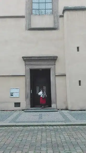 In front of the northern and southern portals there are two smaller porches. The northern one has a Gothic interior. The windows are wide with no tracery, they have a more complex profile and the window jamb similar to the window of the western facade illuminating the main nave and the northern portal to the double-nave. The other porch built in Baroque is covered with a hip roof, with an entry in the aedicula, vaulted by groin vault, similar to the vault under the matroneum. In front of the southern entrance there is a similar porch, vaulted by a barell vault with lunettes as in the main ship.