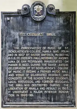 The Conservatory of Music of St. Scholastica's College was founded in 1907 by Sister Baptista Battig OSB, herself a noted concert pianist. In 1932 with the growing popularity of concert music in Manila, Philippines, St. Scholastica's College built a concert hall and named it St. Cecilia's Hall.[1] It was built under the supervision of the renowned engineering firm Pedro Siochi and Company.[2] The hall was named after Saint Cecilia, the patron saint of music and musicians, and soon become the venue of numerous recitals and concerts featuring pianists from St. Scholastica's College-Manila. St. Cecilia's Hall host not only their student's performance venue needs but also Manila's growing social calendar. The forerunner to the Cultural Center of the Philippines, St. Cecilia's Hall was designed by a notable Filipino architect, Andres Luna de San Pedro[1] in the Egyptian Art Deco style.