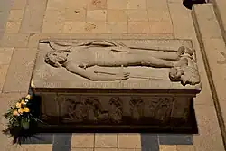 The tomb of Margrave Gero sits in the crossing before the steps to the choir. It is covered by a sandstone slab, carved into Gero's likeness, showing him in armor with sword and a flag. A lion is at his feet.[2]: 29–30