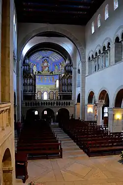 The painted ceilings were added during the 19th-century renovation which also lined most of the walls with cut stone panels - the original Ottonian walls featured rough quarry stone masonry.[1]: 94, 96