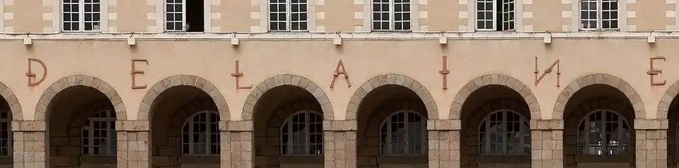 The coat of arms of the abbess Magdelaine de la Fayette is present in relief on both end pavilions and in the centre of the building between the second- and third-storey windows.[2] Her name is featured in the form of iron bars shaped as letters, bolted to the façade, and spaced evenly above the pier of each arch, as MAGDELAINEDLFAYETTE, with the double T joined above one pier.