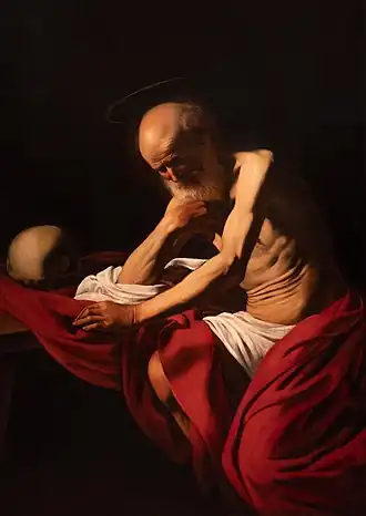 Saint Jerome, hermit, Father of the Church, and responsible for the translation of the Bible into Latin (the Vulgate Bible), was a popular figure in Caravaggio's time, and the artist painted him at least eight times (only three survive). Whether this was from personal choice or at the request of patrons is unknown, but it gave Caravaggio the opportunity to explore the potential – from an artist's perspective – of aged and wrinkled flesh. Jerome is shown here contemplating one of his symbols, the skull, a reminder of the inevitability of death and the vanity of worldly things.