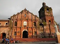 The most prominent and notable part of the church is the façade is made of striking red bricks and adobe.[5] On top of the wooden door entrance is a white sculpted image of the Baptism of Jesus by St. John the Baptist. It also contains stained glass images along with red bricked columns.