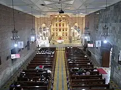 The church has three retablos or altars finished in gold leaf. The retablo mayor (main altar) at the center contains thirteen niches across four levels housing statues of saints.[6] At the center of the lowest level contains the tabernacle. The two minor retablos on each side houses four niches of saints. Originally, these two minor retablos were dedicated in honor of the town's second patron, San Buenaventura and San Antonio de Padua. On the first minor retablo at the left side are Saint Joseph at the top; Saint Joachim at the right sided bottom; Immaculate Conception at the middle bottom; and Saint Anne at the left sided bottom. The statue of Saint Lorenzo Ruiz is situated at the top of the minor retablo; Saint Therese of Lisieux at the left sided bottom; Saint Isidore the Laborer at the middle bottom; and Saint John Vianney at the right sided bottom. It was restored by following the description of a visiting friar through the efforts of Director Emmanuel 'Maning' Borlaza, Mrs. Concepcion Brosas and the people of Liliw.