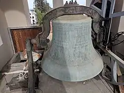 The 42" 1,320 lbs. bronze church bell, cast by the Meneely Bell Foundry of West Troy, New York in 1905 and outfitted by The Verdin Bell Company of Cincinnati, Ohio in 1964, is rung weekdays at noon Angelus, but otherwise is not normally rung due in part to the close proximity of neighbors' homes,[6] and due also in part to the adverse effects the tolling of the bell may have upon the organ pipes, which share the common rear wall of the building.