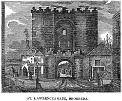 The Saint Laurence Gate is a barbican which was built in the 13th century as part of the walled fortifications of the medieval town of Drogheda in Ireland. It is a barbican or defended fore-work which stood directly outside the original gate of which no surface trace survives.[1] It has been described as one of the finest of its kind,[2] and is designated as a national monument.[3] The original names for Laurence Street and Saint Laurence Gate were Great East Street and Great East Gate, respectively. In the 14th century, the street and gate were renamed because they led to the hospital of Saint Laurence, which stood close to the Cord church.[4]