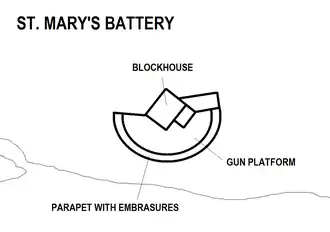 Saint Mary's Battery was built in 1715–1716 to protect the South Comino Channel, in conjunction with Wied Musa Battery on mainland Malta. Construction of the battery cost a total of 1018 scudi. It has a semi-circular gun platform ringed by a parapet with eight embrasures facing the sea. The battery has a single blockhouse, where the ammunition was stored. This was placed diagonally along the land front so that its two outer faces functioned as a redan. The land front also contains musketry loopholes.