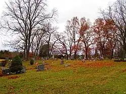 The nearby cemetery contains a variety of large, old trees that are randomly located through the area. A lane encircles the cemetery. Grave markers include a variety of nineteenth and twentieth-century monuments and memorials typical for the time and place. The earliest monuments are white marble slabs.[3]