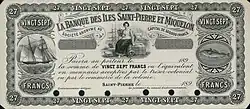 Between 1890 and 1895, the Banque des Isles Saint-Pierre et Miquelon issued 27 and 54 francs notes. These unusual denominations were equivalent to 5 and 10 Canadian dollars. In 1920, the Chamber of Commerce introduced notes in denominations of 0.05, 0.1, 0.25, 0.5, 1 and 2 francs.