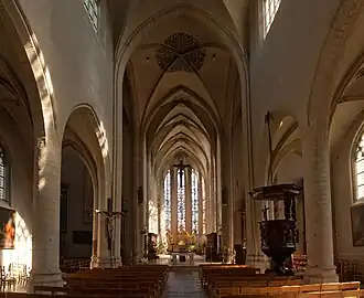 The organ that was built in 1786 by Aegidius-Franciscus Van Peteghem for the Heilig Geestcollege in Louvain was transferred to the church after its abolition during the French occupation of the Southern Netherlands commencing in 1792. The two large pointed arch windows of the cross arms contain neo-Gothic glass windows after a design by the glazier M. Mertens (Koekelberg), restored in 1995–1996. The window in the southern transept contains depictions of the saints Eugenius, Carolus, Clemens and Eduardus, in the window in the north transept Francis, Dominicus, Augustine and Benedictus are depicted. The windows of the choir contain modern glass windows by Michel Martens (1970). The ceiling of the church is still original.[1]