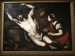 The subject, especially in the depictions where Sebastian has been got clear of his post or tree, has clear similarities to two other scenes from secular Italian epic romances: Angelica and Medoro from Orlando Furioso by Ludovico Ariosto (1516) and Erminia and Tancredi from Gerusalemme liberata by Torquato Tasso 1581. In both of these the hero is wounded in battle, and nursed by his lover; the scene from Tasso was especially popular as a subject, often as part of a cycle.[23] In both the heroes are usually shown sprawled and largely unclothed, their armour often being shown discarded near them, which is also a feature of some Sebastians.[24] There is a painting of the Ariosto subject by Simone Peterzano, who died in 1599, but most treatments of both subjects come from the same broad period after about 1620 as those of Sebastian and Irene. The compositions where Sebastian remains semi-upright as the women untie him inevitably recall the subject of the Descent from the Cross of Christ.[25]