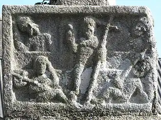 The calvary here is the work of the Roland Doré workshop and was started in 1610. The pietà is regarded as one of Doré's best works. Amongst the statuary is a depiction of Saint Servais with key as well as Saints Peter and Paul. On the reverse side of the depiction of Jesus on the cross there is "Christ aux liens" capturing that poignant moment when Jesus sits awaiting crucifixion. John the Evangelist and the Virgin Mary are on the reverse side of Peter and Paul as Doré uses the Breton tradition of statues "géminées". The cross stands on a square base which carries four bas-reliefs dating to 1548. These depict the flagellation, the crowning with a crown of thorns, Jesus carrying the cross and the Resurrection.[4]