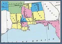 The Saint Stephens meridian, in longitude 88° 02′ west from Greenwich, begins at the initial point (Ellicott's Corner), on the base line, in latitude 31° north, passes through Saint Stephens, Alabama, extends south to Mobile Bay and north to latitude 33° 06′ 20″, and governs the surveys in the southern district of Alabama, and in Pearl River district lying east of the river and south of the Choctaw Baseline, in latitude 31° 52′ 40″ north, in the state of Mississippi.