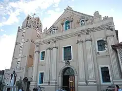 The facade is in High Renaissance style. It is divided into two levels with six Ionic columns on pedestals running the whole height of the lower level.[7] The pediment was ornamented by statued niches symmetrically designed forming as the second level. The lower ends of the pediment are terminated by massive piers. The two levels are markedly divided by wide horizontal cornice. The main entrance is formed by an arch order with a square window above it. The bell tower on the left is a late addition which is in contrast with the high renaissance style of the church facade.[4]