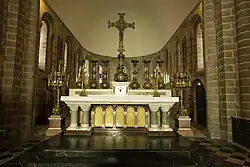 After the church collapsed in 1862, much of the furniture had to be replaced, including the high altar. The new set is said to have been donated by Empress Eugénie around 1865. Neo-Romanesque in style, it is inspired by the church's decoration, particularly the capitals. Made of white, black, green, and red veined marble, it is surrounded on all sides by three steps and topped by a tabernacle. The whole is over 3 m wide and 1.5 m high. For this altar, the goldsmith Placide Poussielgue-Rusand created a cross and two candlesticks in gilded metal and cloisonné compacted oxide layer glaze, which are mounted on supports on either side of the altar. The ensemble was listed as a historic monument on June 27, 1996.[32][33]