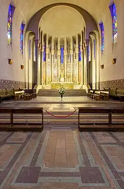 The ceramicist Robert Barriot was in charge of the decoration of the choir. During the fifteen years that the choir was under construction, he and his family lived in the bell tower of the church. Barriot made the retable out of enamelled copper, which depicts the Seven Churches of the Apocalypse and the Twenty-Four Elders surrounding the Heavenly Father.[5]