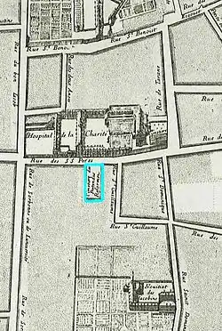 After being forced to give up the Saint-Germain Cemetery in 1604, the Protestants of Paris bought a rectangular garden on the moulin du Pré-aux-Clercs mound on rue des Saints-Pères from Joachim Meurier, a master goldsmith from Île de la Cité. It was roughly 13 toise (24 m) by 23 toise (42 m). The first burials were on 21 March 1604 and the cemetery was used up until the Revocation of the Edict of Nantes in 1685, after which it was renamed Charité Cemetery (cimetière de la Charité) and used by the Hôpital de la Charité. It was enclosed by a 3m high wall and received at least one body a day. Like all the inner-city cemeteries, it was closed in 1785 by order of the inspector general of quarries Charles-Axel Guillaumot - the contents of its tombs and charnel houses and its burials at a depth of at least 100m were transferred to the new Catacombs of Paris, a set of re-used quarries on what is now Rue de la Tombe-Issoire.