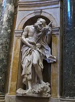 Scholars have emphasised the mystical experience being undergone by the figures. Rudolf Wittkower documents the "intensification of the visionary quality" in the statues, both figures engaged not in the physical world around them, but absorbed in their own spiritual spaces.[3] Howard Hibbard continues this line of argument, demonstrating how the figures break out of the niches which are supposed to contain them—further evidence of how Jerome and Mary Magdalen are not constrained by the earthly world but responding to something higher.[4]
