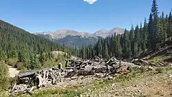 A prospector named Coley discovered silver in 1863 or 1864 on the slope of Glacier Mountain, and built a crude furnace to extract silver from the ore. Other prospectors followed, including John Cullom, who discovered the Saints John Lode. In 1867, he sold the Saints John lode to the Boston Silver Mining Company, which built an ore mill, next to which grew the town, originally called Coleyville.[2][3] The mining at Glacier Mountain was usually expensive and was burdensome upon the up to 50 townsfolk in the early years.[2] In the 1870 census, the town name had changed to Saints John by local Masons when it had a population of 71, which made it the largest incorporated town in Summit County.[4][5]
