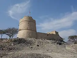 The fort, on a hilly position,[2] became ruined, but has now been restored.[3] It has a round watchtower, with views of the modern Fujairah City, where Fujairah Fort is located.[4]