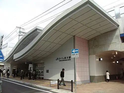 Sakura Shukugawa Station (さくら夙川駅, Sakura Shukugawa eki) is a passenger railway station located in the city of Nishinomiya, Hyōgo Prefecture, and is operated by the West Japan Railway Company. [2] As a part of the JR West Urban Network, the following cards are accepted: J-Thru Card, ICOCA, Suica, and PiTaPa. The station's name comes from the park approximately 200m west of the station, Shukugawa Park (夙川公園). The park is situated on the banks of the Shukugawa riverbed and is famous for its annual display of Cherry Blossoms, and is quite a popular site for flower viewing parties.